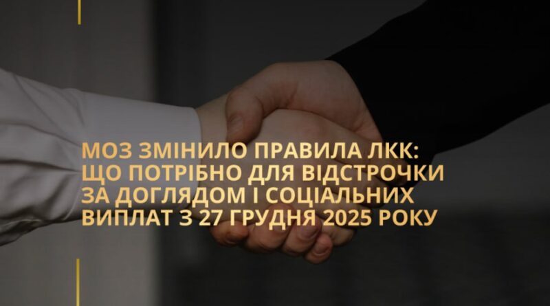 Читати даліМіністерство охорони здоров’я уніфікувало медичні висновки про потребу в догляді – замість кількох різних форм залишається одна. Документ позбавить органи соцзахисту можливості відмовляти у видачі актів догляду через бали чи формальні причини. На сайті МОЗ оприлюднено наказ від 27.11.2025 № 1811 «Про внесення змін до наказу Міністерства охорони здоров’я України від 09 березня 2021 року № 407» (далі – Наказ № 1811) та наказ від 05.12.2025 №1850 «Про внесення змін до наказу Міністерства охорони здоров’я України від 27 листопада 2025 року № 1811» (ним внесені редакційні правки). Наказом № 1811[…Читати далі…]
